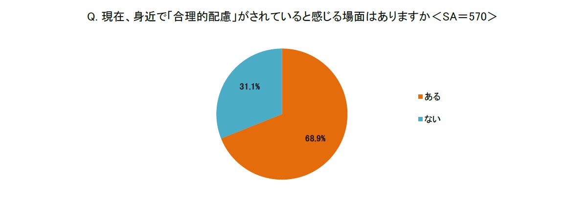 また、「現在、身近で合理的配慮がされていると感じる場面はありますか<SA>」という問に対しては、7割以上の親が「はい」(399)と回答しました。合理的配慮という言葉自体は知らずとも、普段の生活の中で行動自体は浸透しつつあることが伺えます。