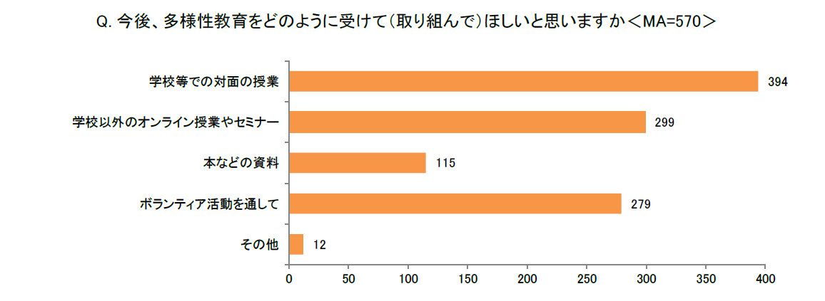 また、今後子どもたちに取り組んでいってほしい多様性教育の学び方としては、約7割の親が「学校等での対面授業」(394)と答え、次いで半数以上の親が「学校以外のオンライン授業やセミナー」(299)、「ボランティア活動を通して」(279)と回答しました。子どもたちが様々な体験や経験を通し、実際に感じたことを活かしながら、学んでほしいと考えていることがわかります。