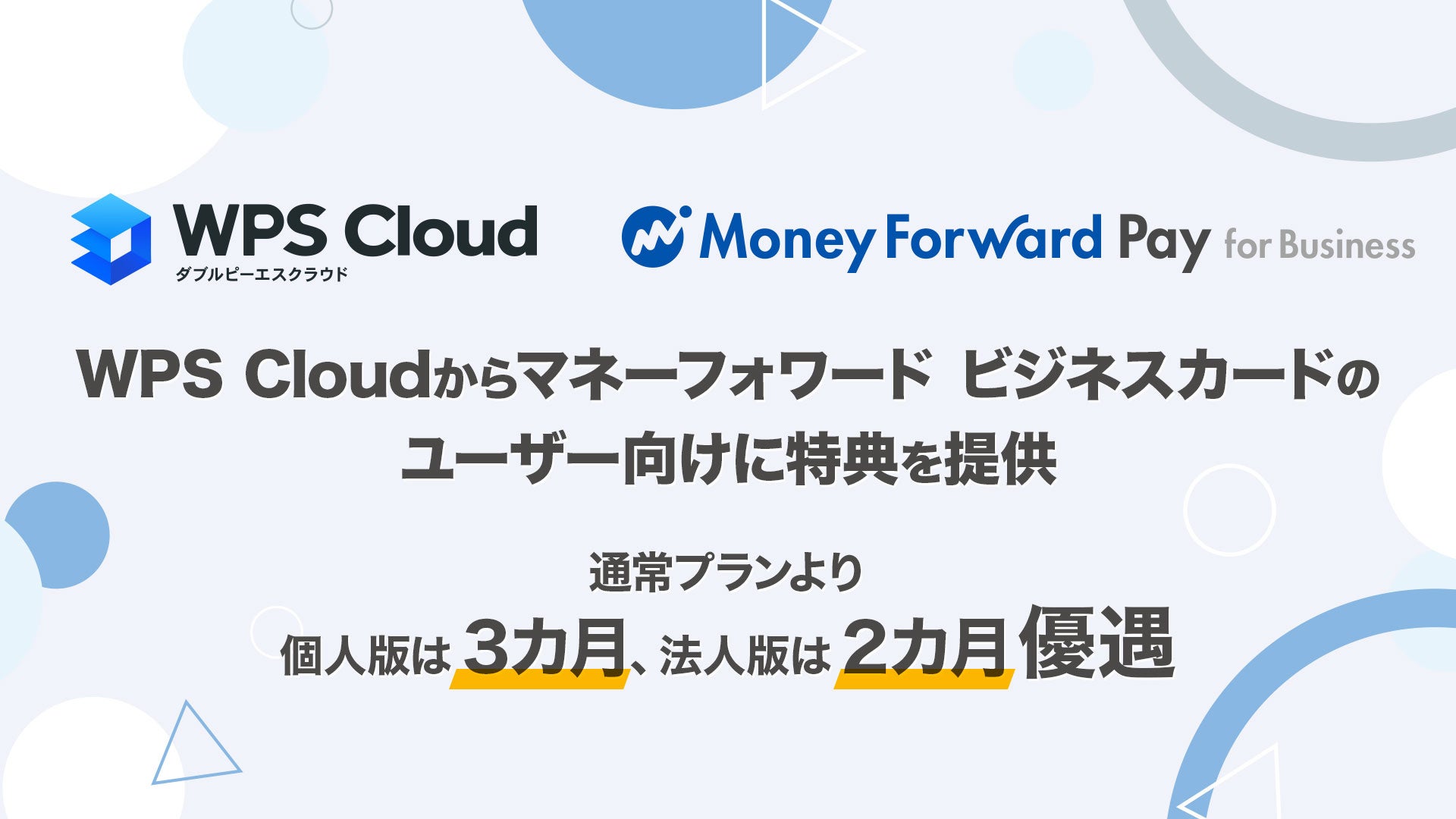 「マネーフォワード ビジネスカード ユーザー特典」は、「マネーフォワード ビジネスカード」を利用する個人事業主・法人向けの特典プログラムです。当社の優待サービスの提供により、「マネーフォワード ビジネスカード」の個人ユーザーは「WPS Cloud」を通常プラン(1年 or 半年)と同価格で3カ月利用を延長することができます。また、法人ユーザーは「WPS Cloud Pro」を2カ月無料でご利用いただくことができます。