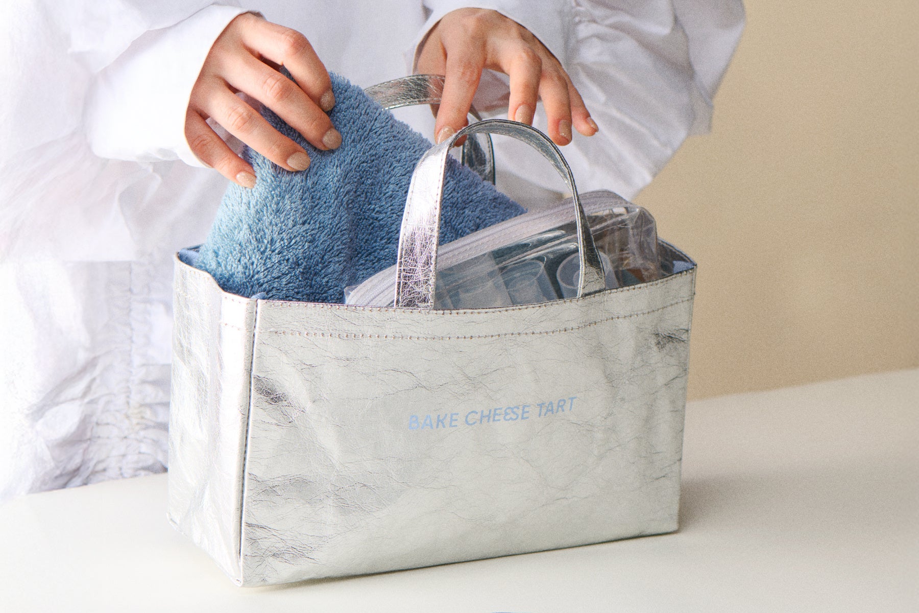 さらに今年は「BAKEオリジナルシルバーバッグ」がついたオリジナルグッズセットも登場。ブランドカラーのシルバーに、ライラックブルーであしらわれたロゴがポイントのバッグは、チーズタルトの6個BOXもすっぽり入るマチの広さで、普段使いしやすくランチバッグなどにもご利用いただけます。