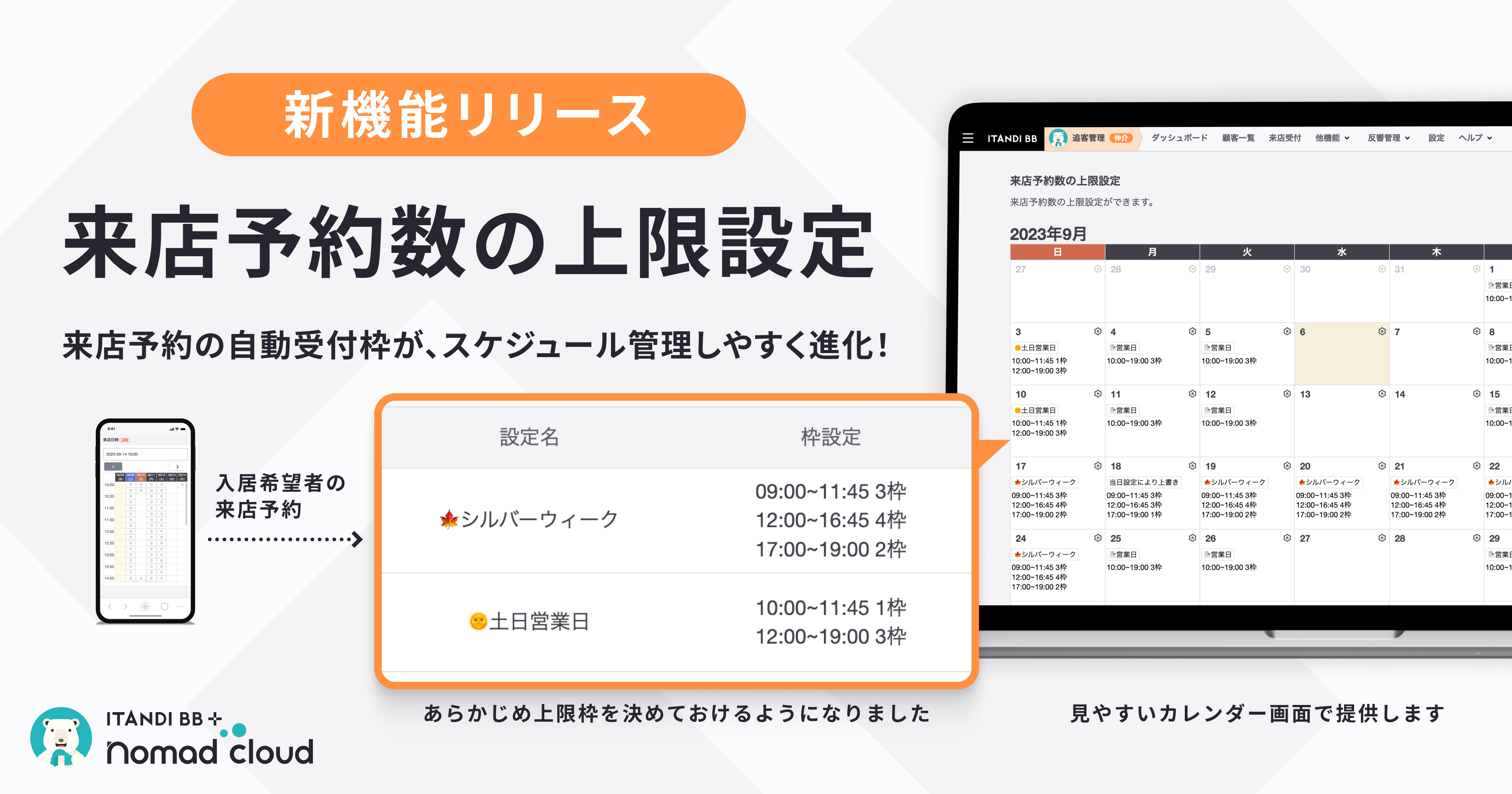 賃貸顧客管理システム「ノマドクラウド」、来店予約カレンダー機能に予約数の上限設定機能を追加