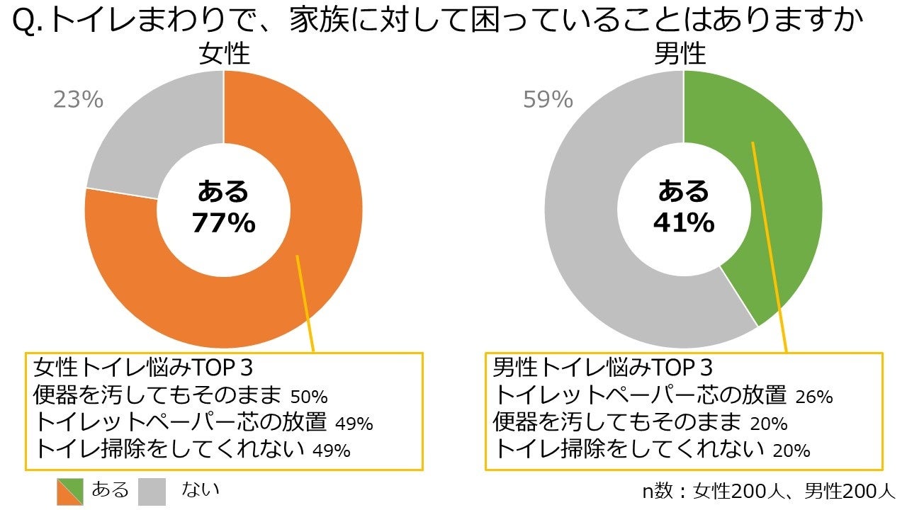 また、家庭の中でも家族全員の使用頻度が高い、トイレで家族に対して困っていることについては、「便器を汚してもそのまま」「トイレットペーパーの芯の放置」などの不満を感じていることがわかりました。