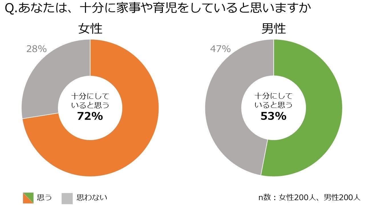「あなたは十分に家事や育児をしていると思いますか」に対して、「十分に家事や育児を行っている」と回答した男性は53%と2人に1人の結果に。女性では72%を占めました。