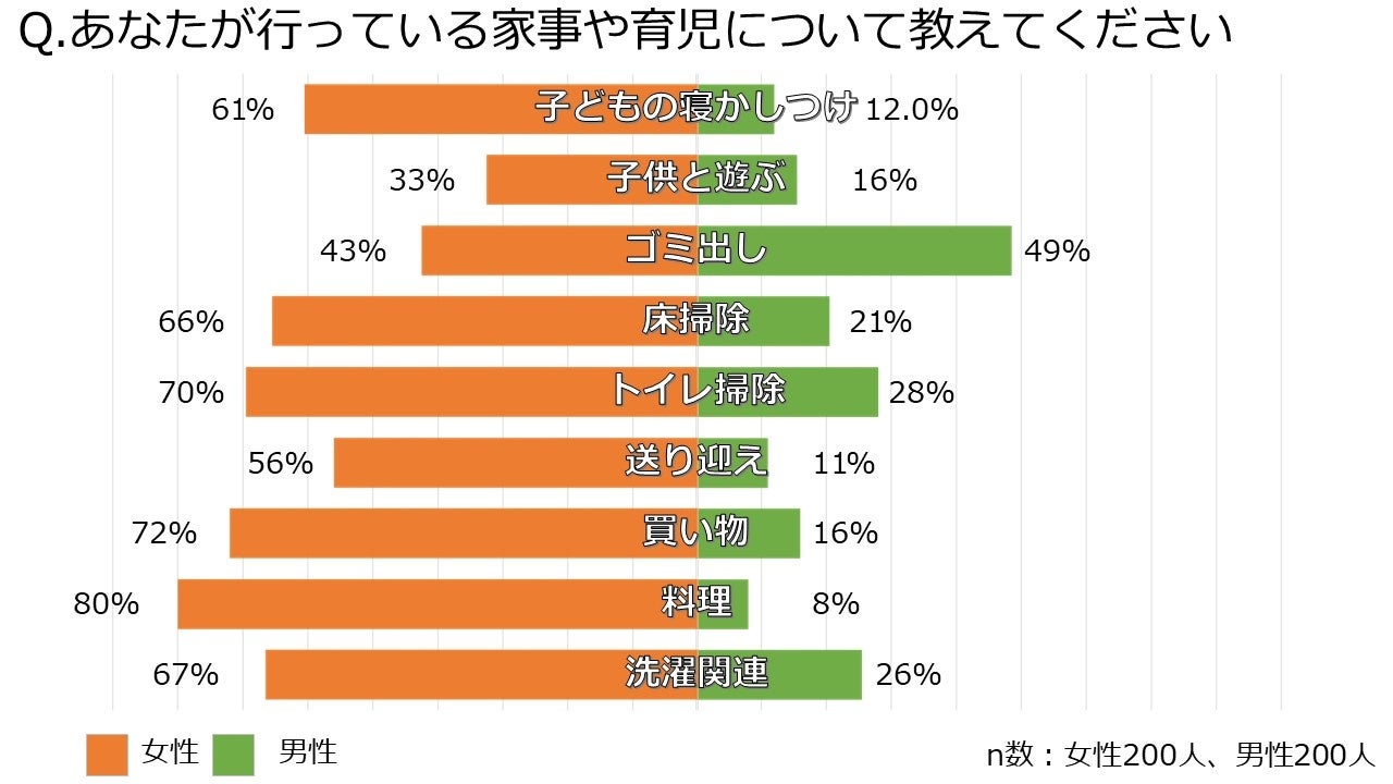 一方で、男性の2人に1人が「十分に家事や育児を行っている」と回答するも、実際の働きとして家事や育児で行っていることについて調査したところ、「ゴミを集めて出す」を除き、家事や育児を十分にできているという男女間の認識に全てにおいて女性の方の割合が高いという結果に。家事や育児を十分にできているという男女間の認識に、差があることが明らかとなりました。