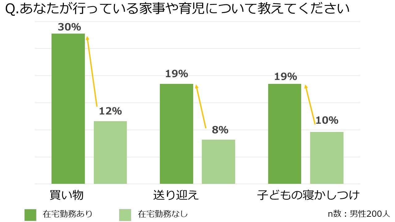 さらに、家事や育児について、在宅勤務をしている男性としていない男性で比較したところ、「買い物」「送り迎え」「子どもの寝かしつけ」において約2倍の差があることがわかりました。通勤時間がなくなることにより、子どもと一緒にいる時間や家事の時間が増えていることがうかがえる結果となりました。