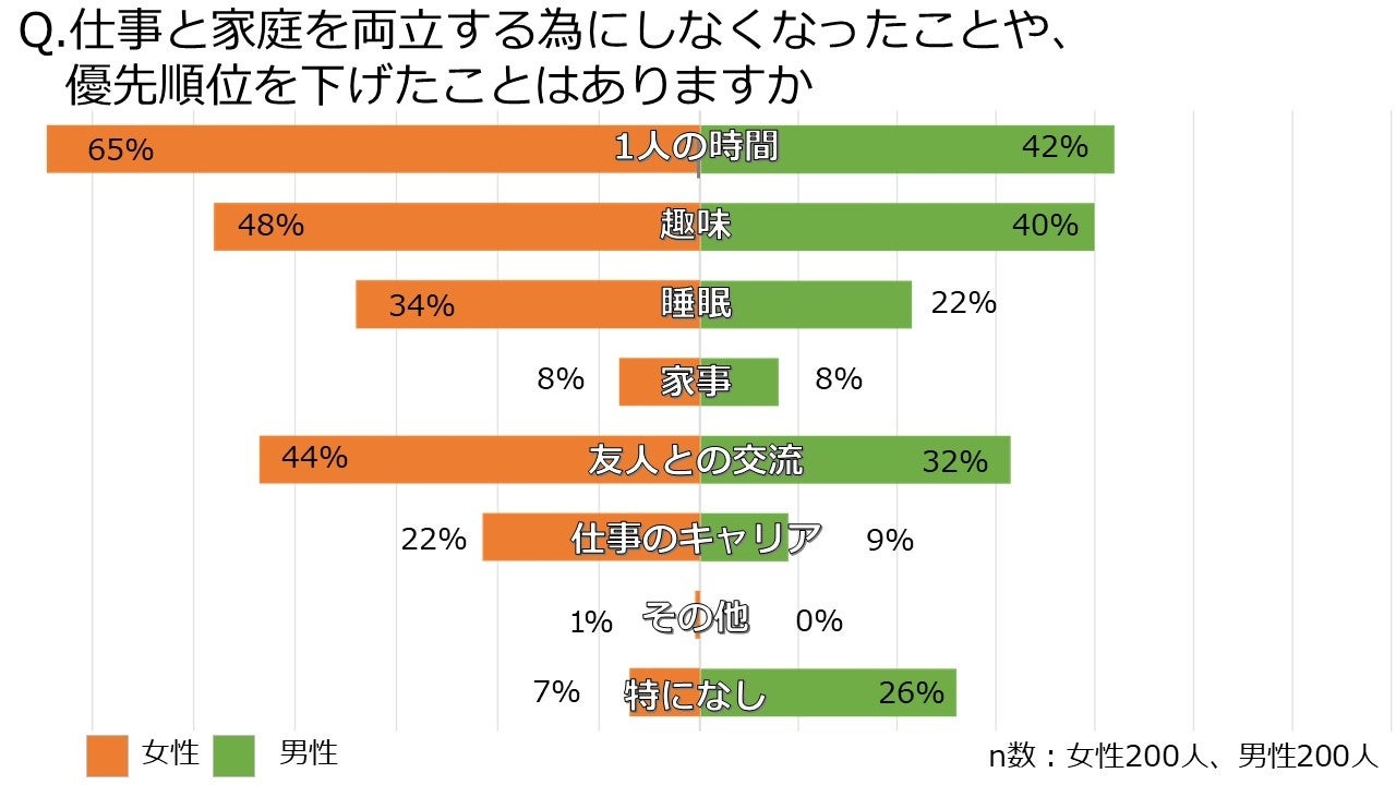 仕事と家庭を両立するために、26%の男性は「優先順位を下げたものはない」と答えた一方で、93%の女性は、1人の時間、友人の交流、睡眠などの「優先順位を下げている」ことがわかりました。