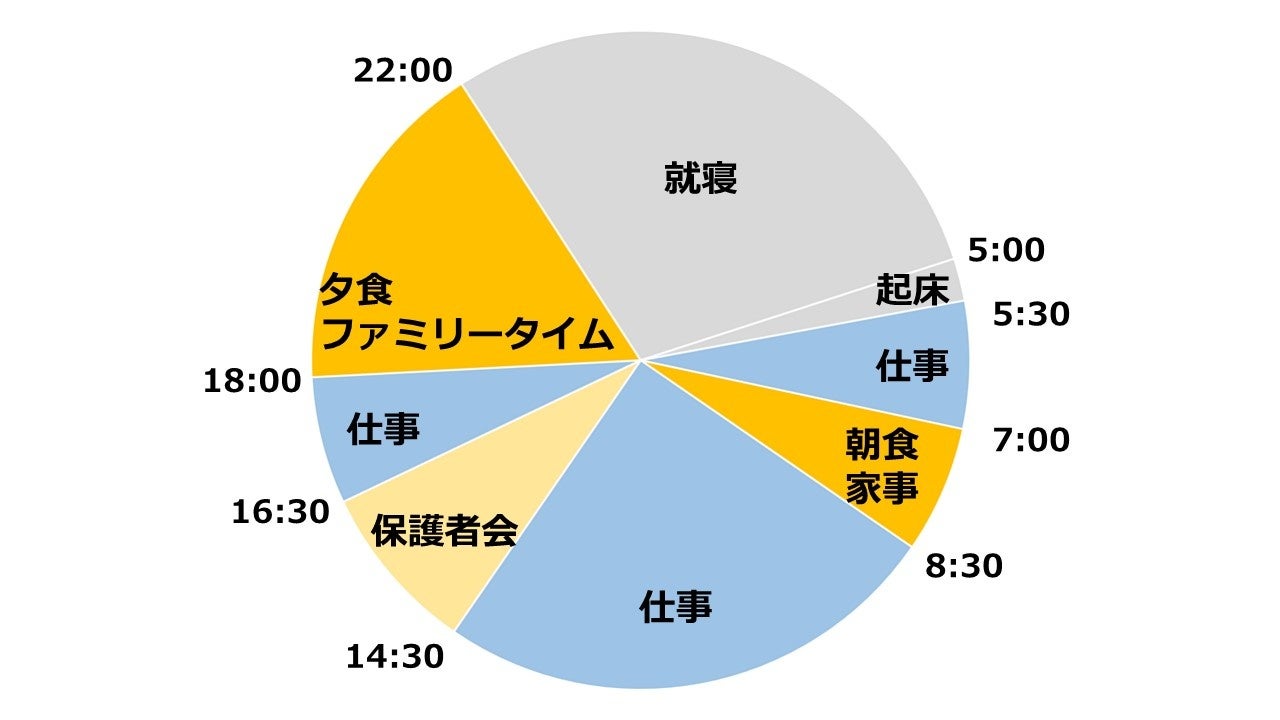 コアタイムがなく、従業員が自分自身の状況に応じて働く時間帯を選択できるスーパーフレックス制度を活用し、働く時間は定時の8時半~17時20分ではなく、朝早くから始業し、合間に家事や保護者会などの用事も済ませています。フルタイムワークですが、出社勤のための移動がないため、18~22時は家族のための時間をしっかりと確保できます。