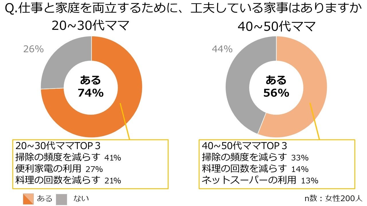 約8割の20~30代の女性は、仕事と家庭を両立するために家事を工夫していることがわかりました。