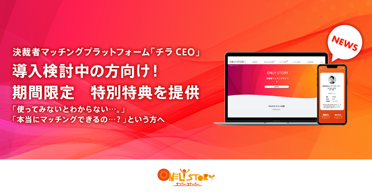 決裁者マッチングマッチングプラットフォーム「チラCEO」を運営する株式会社オンリーストーリー(代表取締役:平野哲也、本社:東京都渋谷区)は、10月3日(月)〜10月31日(月)に導入検討者向け期間限定キャンペーンを実施いたします。期間中の問い合わせに対しては通常プランとは別に期間限定特典を用意し、ご案内します。