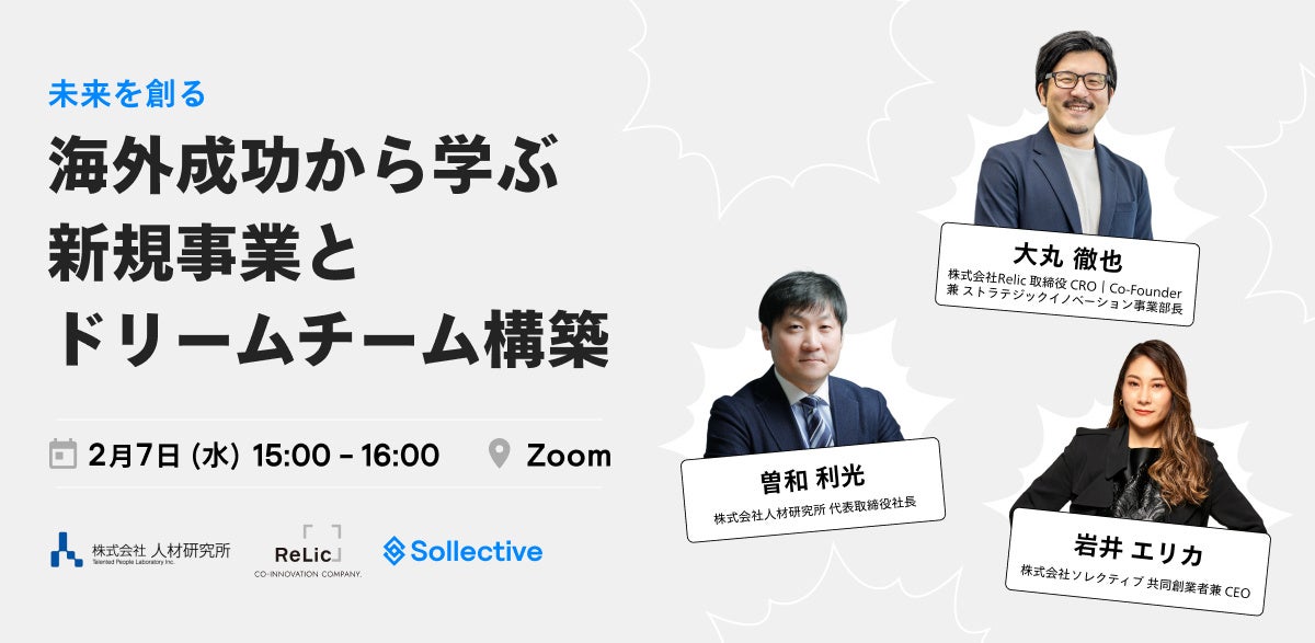 日本企業の新規事業開発やイノベーション創出を支援する事業共創カンパニーである株式会社Relic(本社:東京都渋谷区、代表取締役CEO:北嶋 貴朗、以下「Relic」)は、企業の課題をプロ人材の力で解決する株式会社ソレクティブ(本社:東京都品川区、代表取締役:岩井エリカ)が主催するウェビナー「未来を創る:海外成功から学ぶ新規事業とドリームチーム構築」に登壇します。開催は2024年2月7日(水)15:00から、オンラインで無料配信されます。