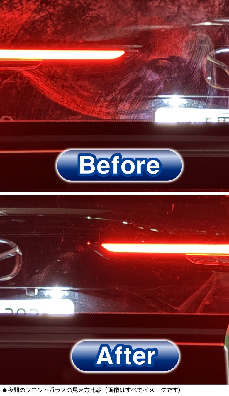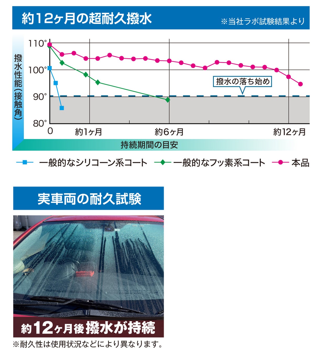 本製品はフッ素が空気中の水分と反応し、ガラス表面と強固に密着することで、超耐久被膜を形成。油膜の付着を防止し、雪・キリの凍結も軽減。 -