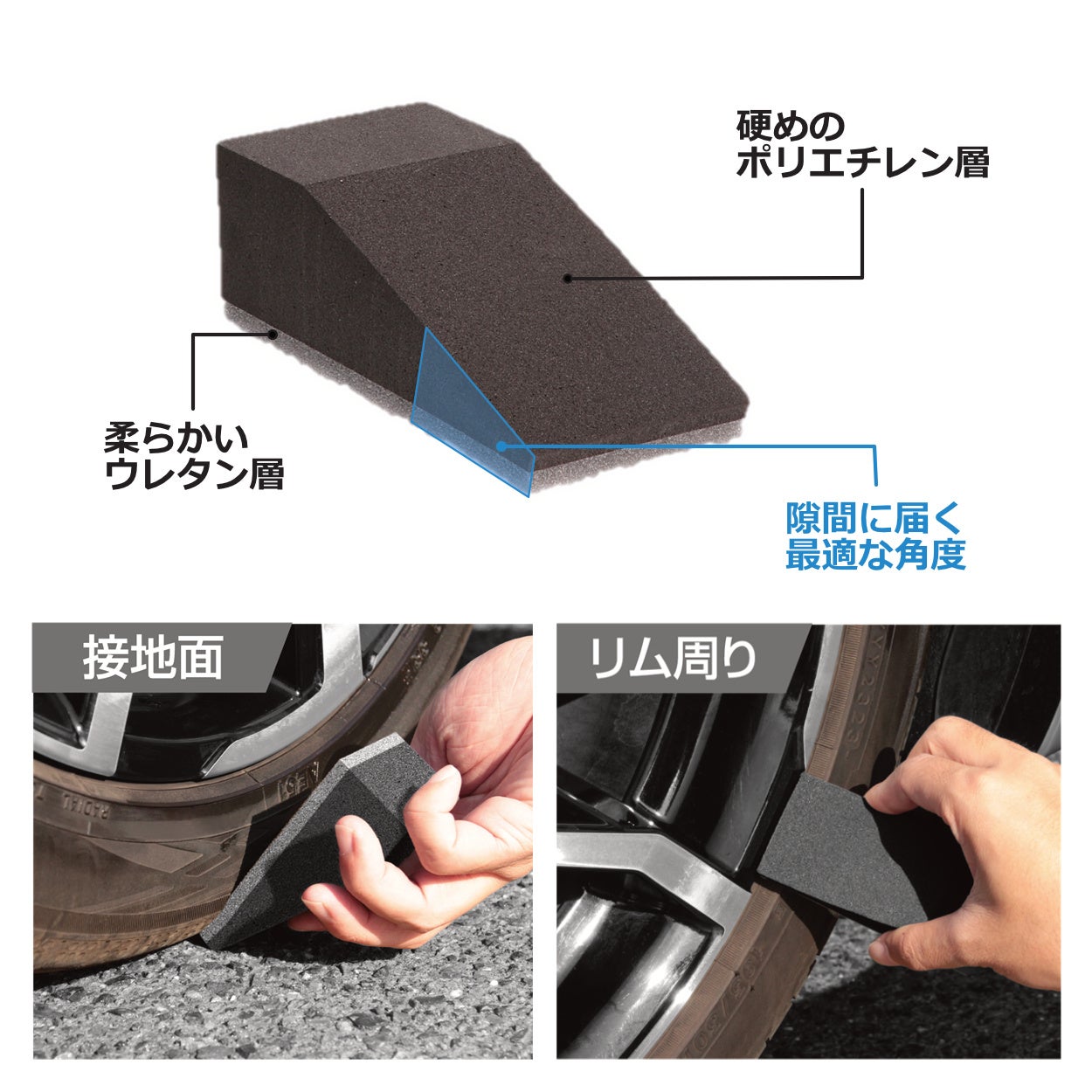 接地面やリム周りやなどの隙間にも施工しやすい最適な角度の専用スポンジを付属。スポンジは液を吸収するウレタンと硬めのポリエチレンの2層構造。手が汚れにくく、程よい硬さでジェルを塗りやすい(上画像:右)