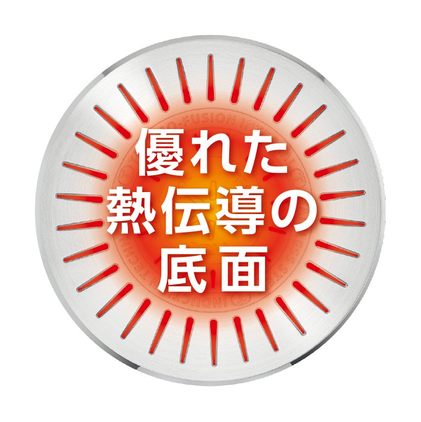 底面は熱伝導に優れたアルミニウムをステンレス鋼で挟んだ3層構造。これによって熱が素早く均一に伝わるため、炒めものも焼きムラなく仕上げることができます。