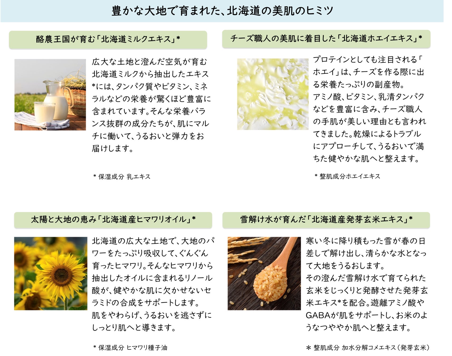 日本一の酪農文化を誇る北海道。果てしなく広がる牧草地、澄み渡る空気、そして厳冬を越えキラキラと輝き出す春の雪解け水。そんな雄大な大地で育まれた「北海道ミルク」など、肌にもうれしい栄養がたっぷり詰まった北海道の恵みをギュッと贅沢に配合しました。ほんのり甘い北海道ミルクの香りで肌を包み込み、しっとり健やかなうるおい肌へと導きます。