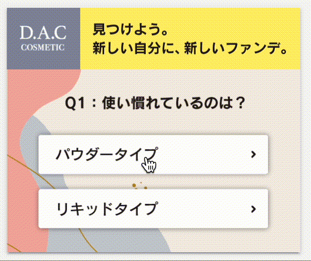 複数商材の案件に適したフォーマットです。広告クリエイティブ内の2択の設問を通し、広告接触者に適した商材を提示することができます。潜在ニーズにアプローチできるのが強みです。