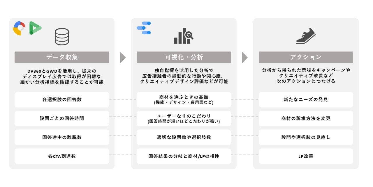 「Q&A CREATIVE」では、「GWD」を活用することでシームレスな「DV360」への連携に加え、スライド毎のクリック数、平均表示時間や各CTA到達数など、従来のディスプレイ広告では取得が困難だった細かなレポート指標が特長です。またこれらの独自指標のデータを用いて、広告接触者の能動的な行動や関心度、クリエイティブデザイン評価などの分析を行い、分析から得られた示唆を商材訴求の見直しやクリエイティブ改善など次のアクションへつなげます。クリエイティブ制作から配信・分析までをワンストップで提供することで、広告の運用・分析工数を削減し、最適なクリエイティブ選定に向けた高速PDCAを実現します。
