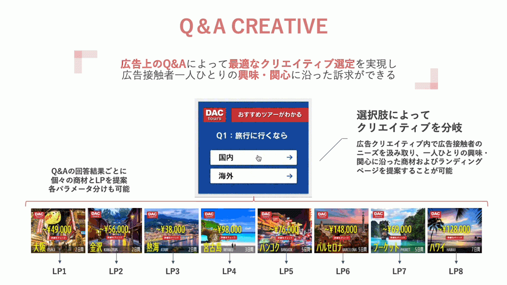 「Q&A CREATIVE」はクリエイティブ内に設置した簡単な設問を通して、広告接触者が自ら商材を選択できるインタラクティブ広告です。ランディングページ遷移後ではなく広告上で設問に回答できるため、導線が短くなり、途中離脱の防止につながります。また個々の回答結果に応じた商材の提案やランディングページの表示が可能です。広告接触者が設問の選択肢に対してアクションすることで、自身も気付いていない潜在ニーズを引き出します。これにより、広告接触者の興味・関心が醸成され、よりコンバージョンの見込みが高い状態でランディングページへ誘導することができます。