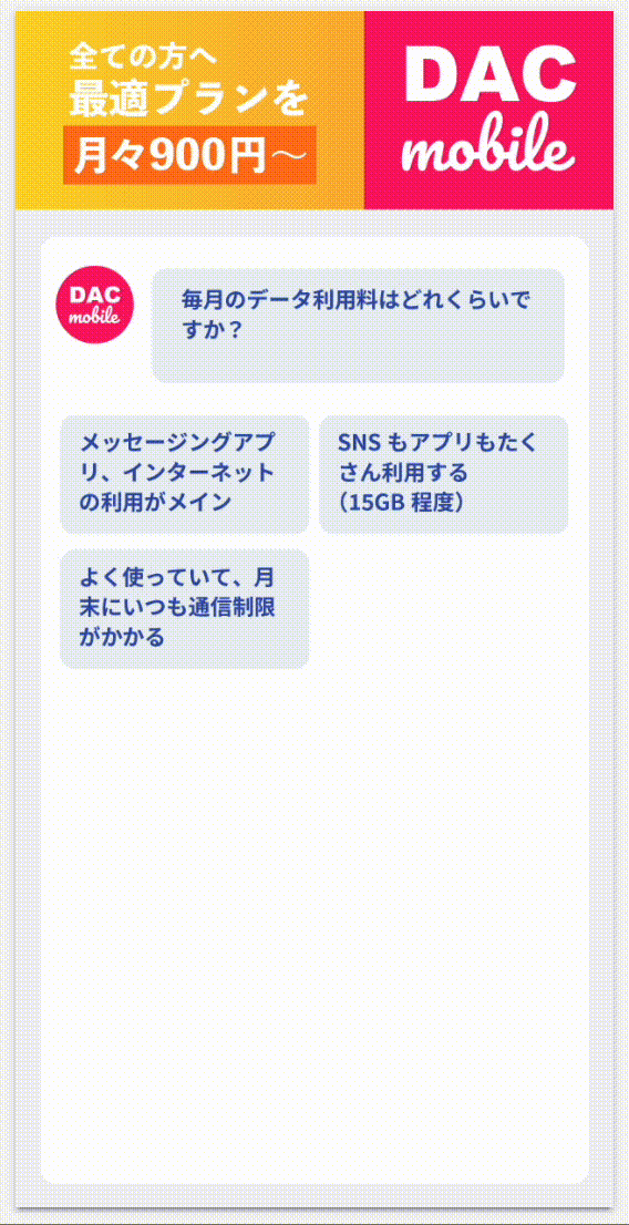 ①②と比較して、よりインタラクティブ性の高いフォーマットです。実際に対話しているような印象を与えることができるため、ブランドや商材に対して親近感を高めるのが特徴です。