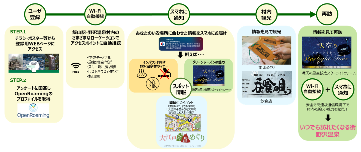 本実証では、野沢温泉村に来訪された方がOpenRoamingを利用してWi-Fiに接続したタイミングで、開催中のイベントや季節のおすすめ情報、観光スポットなどをプッシュ通知でご案内します。