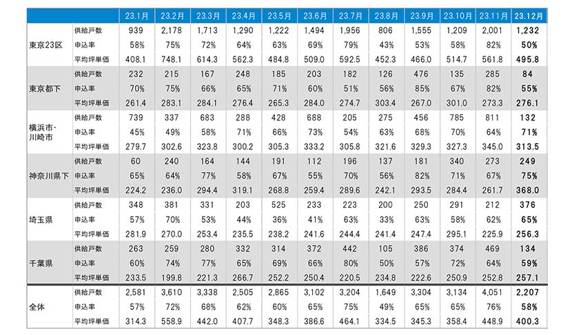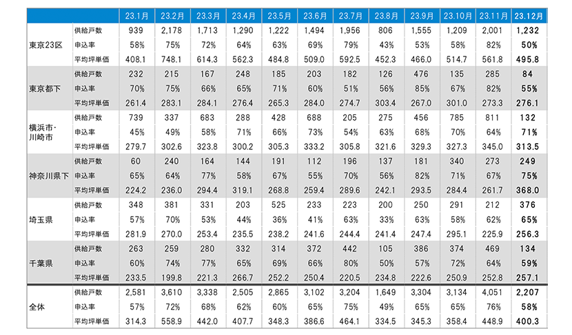月例新築マンション動向発表~首都圏新築マンション、平均坪単価が前年同月比22.8%上昇(2023年12月度分譲実績)2024年3月号~