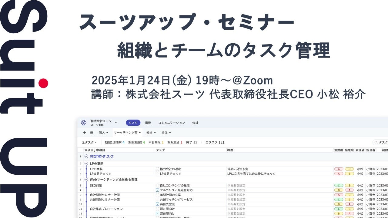 株式会社スーツ(所在地:東京都千代田区、代表取締役社長CEO:小松 裕介)は、2025年1月24日(金)19時から、当社代表の小松が講師を務めるスーツアップ・セミナー「組織とチームのタスク管理」を無料開催します。