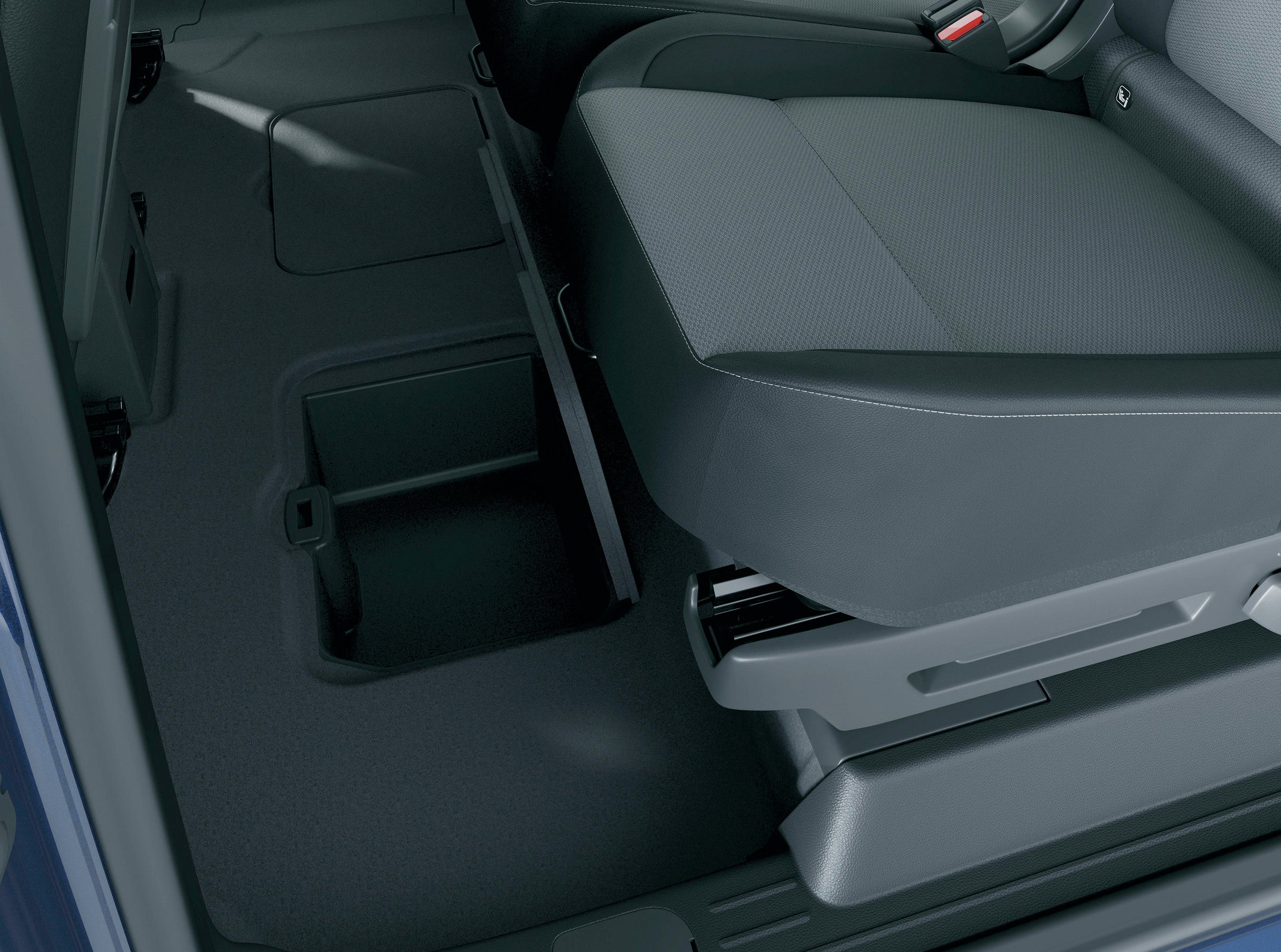 2列目シート左右の足元には、蓋付きの収納スペースが設けられていて、小物の整理や人目に触れさせたくない物の収納に便利です。