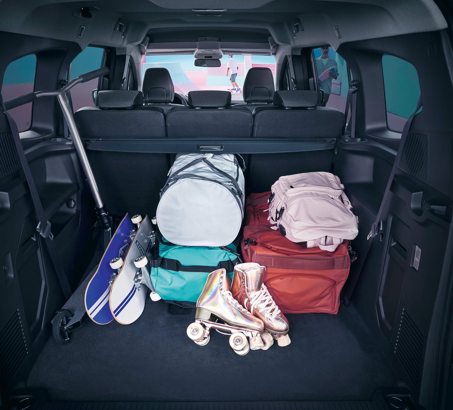 ルノー グランカングーには、取り外しが可能なロールアップ式のトノカバーが装備されています。このトノカバーは長さが調節できるため、7人乗車時には3列目シートの後ろに、3列目シートを折り畳んだり取り外した際には2列シートの後ろに装着し、荷室全体をカバーすることができます。