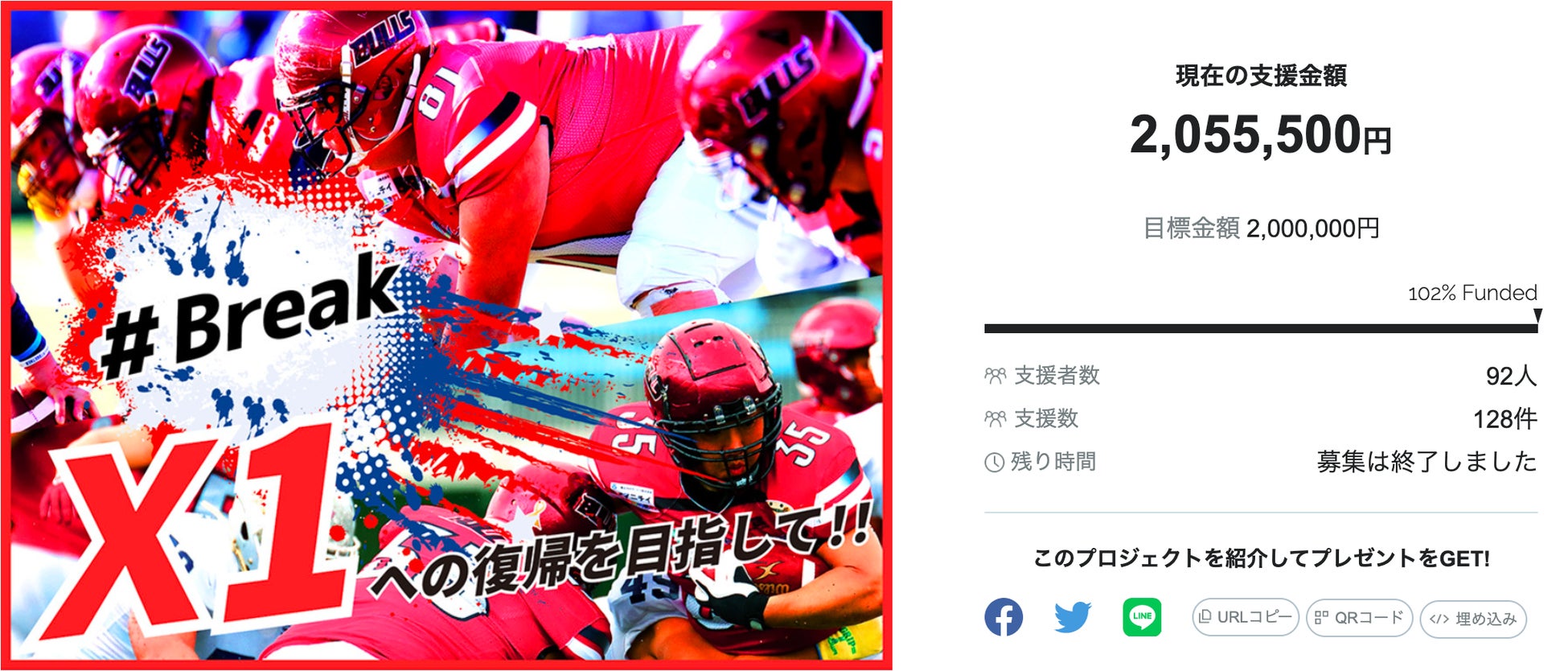 クラウドファンディング目標達成!アメリカンフットボールチームのBullsフットボールクラブ「X1への復帰を目指して!! #Break」