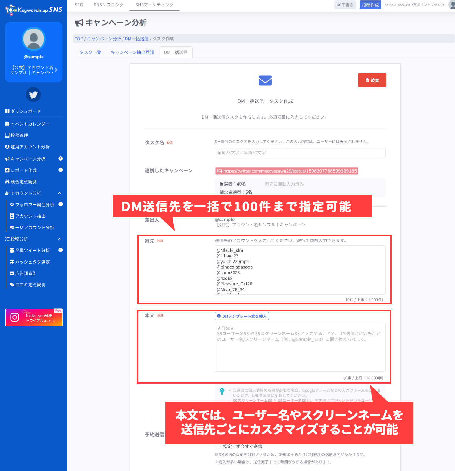 キャンペーン分析で抽出した応募者リストから抽選を実施し、当選者情報を本機能に連携することができます。DM一括送信は、1度の送信で、100件の宛先を指定できます。送信本文設定は、ユーザー名(例:田中太郎)やスクリーンネーム(例:@Sample_ABCDE)を自動で本文に挿入できます。