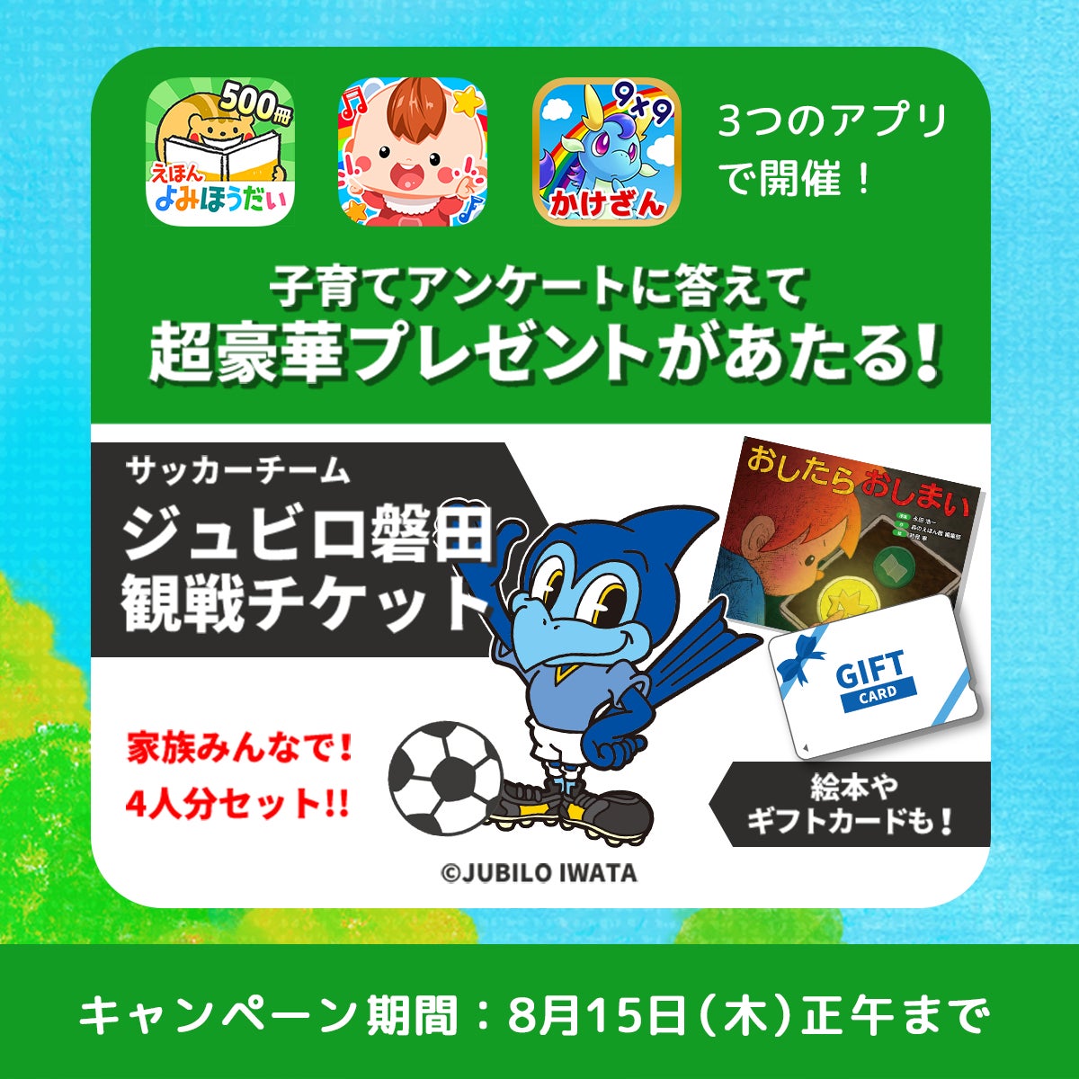 株式会社アイフリークモバイル(所在地:東京都新宿区、代表取締役社長:吉田 邦臣、以下 当社)は、当社が運営する「森のえほん館」「あそびタッチ」「九九のトライ」の3つのアプリにおいて、当社がサポーティングカンパニーを務めるサッカー明治安田J1リーグ所属のクラブ「ジュビロ磐田」(運営会社:株式会社ジュビロ、以下 ジュビロ磐田)の試合観戦チケットなどが当たるアンケート企画を2024年7月22日(月)より実施中であることをお知らせいたします。