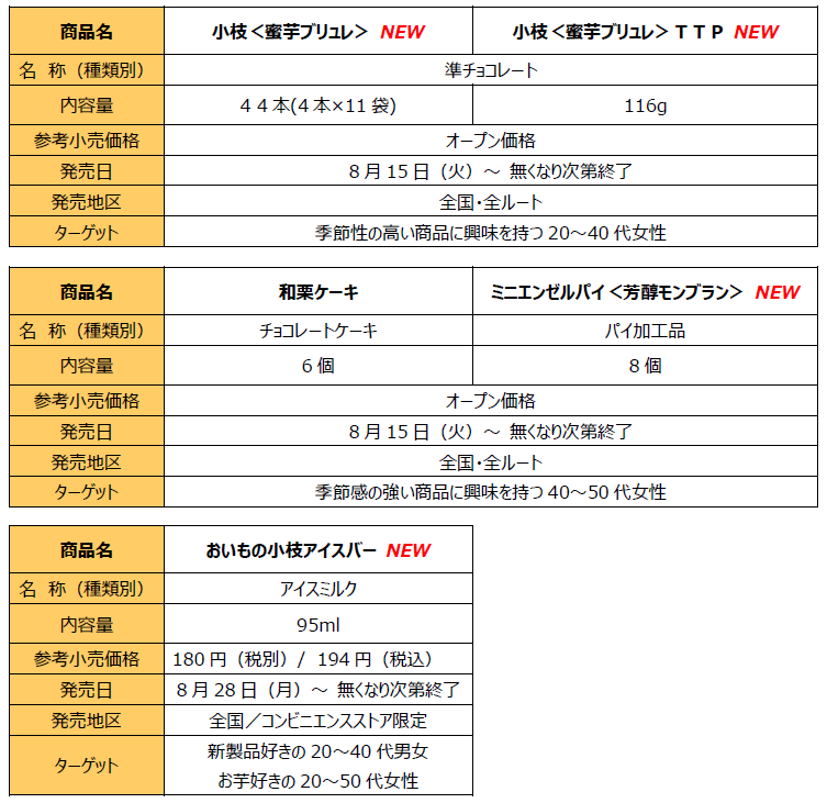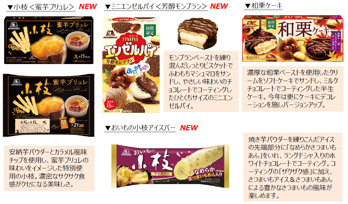 9月9日は、五節句のひとつ「重陽の節句※」。「栗の節句」とも言われ、古くから秋の収穫を祝って栗を食べる習慣があります。森永製菓では2011年から秋の味覚を楽しんでいただこうと栗フレーバーの商品を発売してきました。今年は毎年大変好評を頂いている「和栗ケーキ」に加えて、モンブランペーストを使用した「ミニエンゼルパイ<芳醇モンブラン>」を発売。また、各社から秋の味覚にちなんだ商品が多く発売されており、芋味のお菓子やアイスの人気も高いことから「小枝<蜜芋ブリュレ>」そして「小枝アイスバー」としては初のお芋フレーバーである「おいもの小枝アイスバー」を新発売いたします。森永製菓の主力商品で秋の味覚のお菓子・アイスをご提供することで、秋の店頭を盛り上げるとともに、お客様に笑顔をお届けしてまいります。