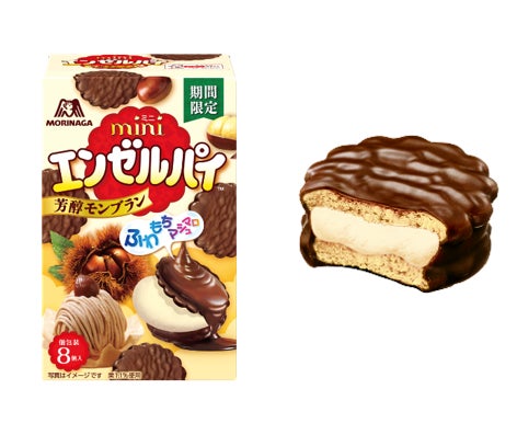 モンブランペーストを練り混んだしっとりビスケットでふわもちマシュマロをサンドし、やさしい味わいのチョコレートでコーティングしたひとくちサイズのミニエンゼルパイ。