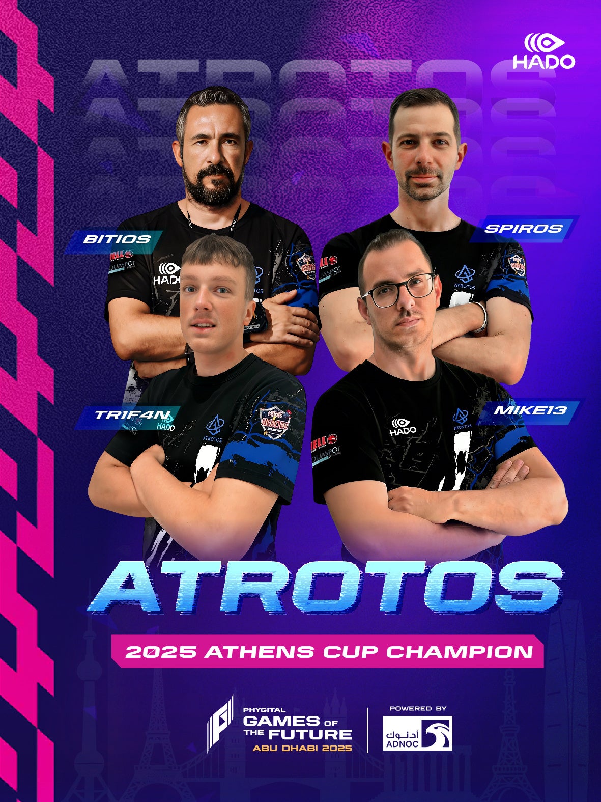 Spiros Spatoulas を中心に、Georgios Bitios とともにギリシャにおけるHADOの発展を牽引。Michail Papadimitrakis(MIKE13) が守備の要を務め、Spyridon Spatoulas(SPIROS) と Ionut-Marian Trifan(Tr1f4N) が攻撃面で多彩な役割を果たします。規律ある構造と高い競争力を備え、欧州トップクラブとしての地位をさらに強固なものにすべく大会に挑みます。