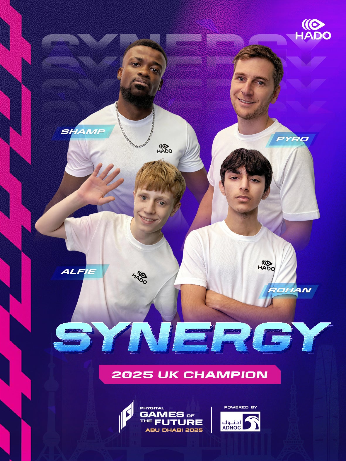 Synergyは、ヨーロッパでも屈指の戦略性を誇るクラブチームです。イングランド代表HADOチームを構成する選手たちで編成され、HADO WORLD CUPへの複数回出場、ヨーロッパ選手権、ホームネーションズ選手権優勝など、豊富な国際経験を有しています。