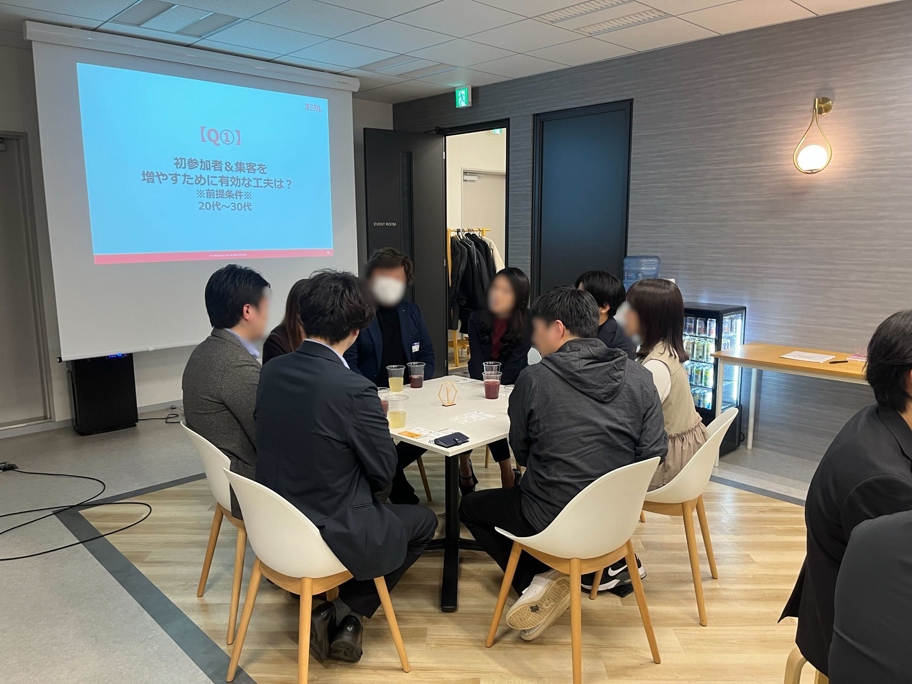 メインコンテンツであるグループディスカッションでは、「初参加者&集客を増やすために有効な工夫は?」「イベント後リピート参加につなげるための工夫は?」といった、婚活事業者が抱える具体的な課題をテーマに、意見交換が行われました。