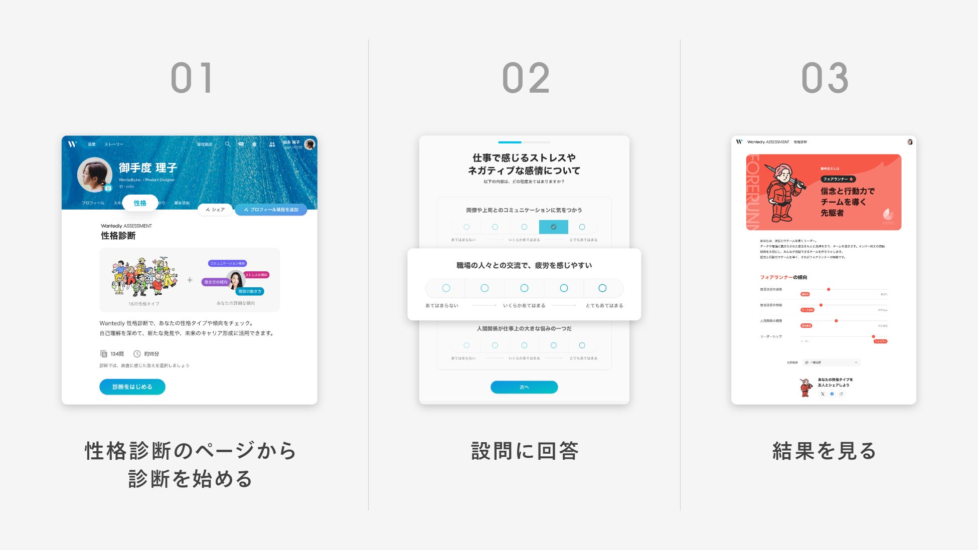 ユーザーは、ブラウザ上もしくは、個人のWantedlyプロフィールから、性格診断のページ(https://assessment.wantedly.com/personality/questions)にアクセスします。その後、画面の案内に従って「人との付き合い方」や「仕事への取り組み方」といった、全134個の質問に回答をします。