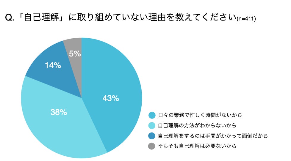 しかし、実際に「自己理解」をするための行動をしているのは55%という結果に。自己理解ができてない理由としては「日々の業務で忙しく、時間がないから(43%)」が最多。