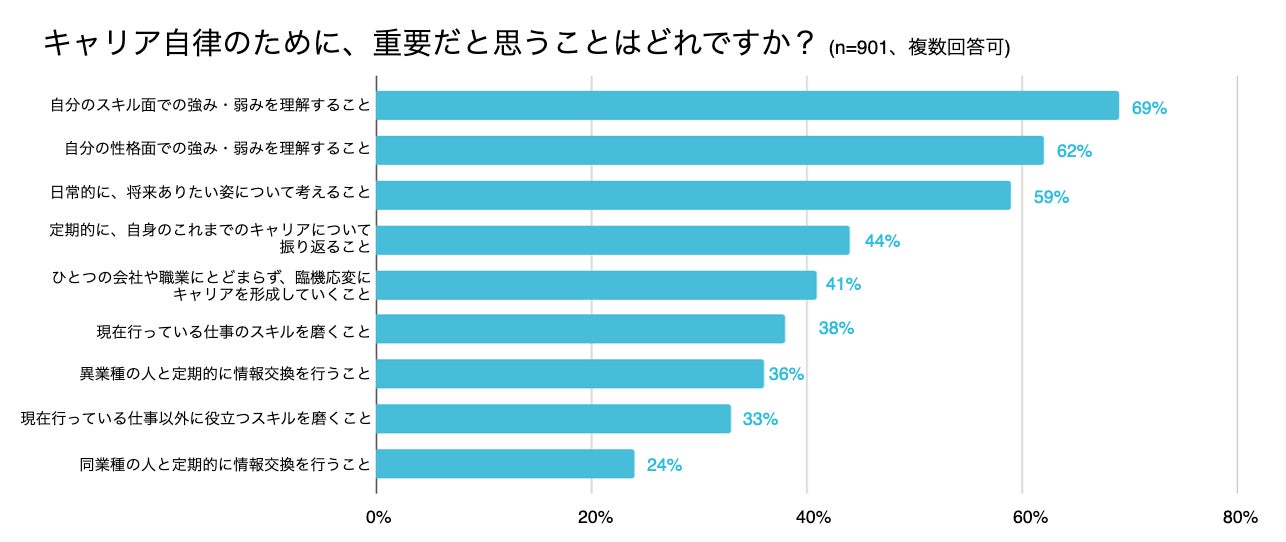 「キャリア自律」のために重要であることとして「自身のスキル面での強み・弱みの理解(69%)」、「自身の性格面での強み・弱みの理解(62%)」、「日常的に、将来ありたい姿について考えること(59%)」が上位に。