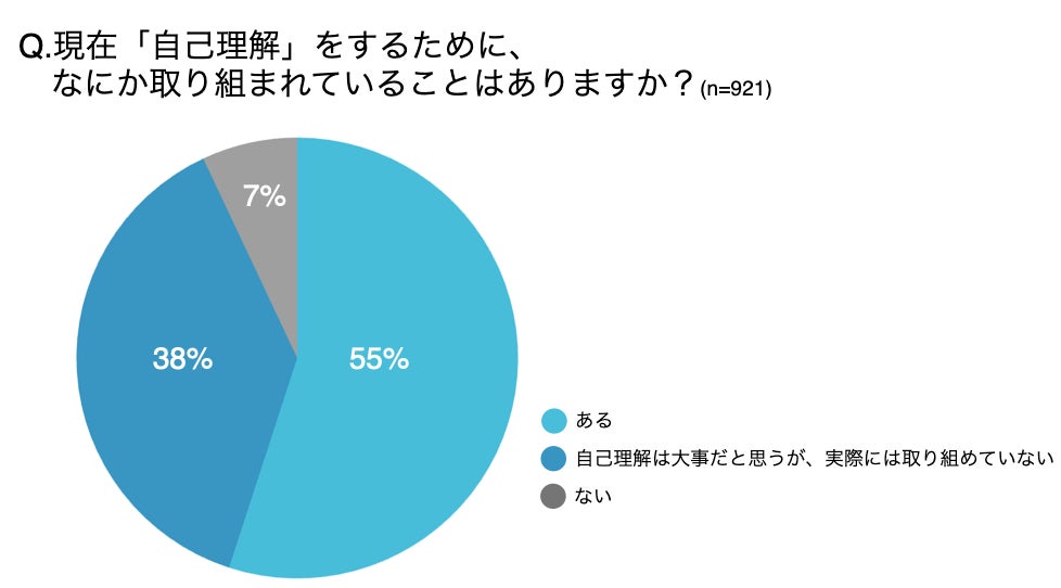 「自己理解」をするために、何か取り組んでいることはあるか聞いたところ「ある」は55%、「ない(自己理解は大事だと思うが、実際には取り組めていない+ない)」は45%となり、自己理解のための行動をしている人の割合は、約半数という結果に。