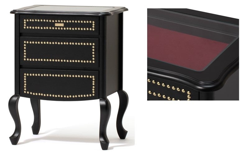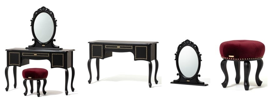 きれいな曲線美が醸すラグジュアリーな雰囲気とブラック×ゴールドスタッズのアクセントを効かせたデザインのドレッサーシリーズです。優雅なデザインながらも引き出しと左右の扉付きストレージで収納力もあり実用性も兼ね備えています