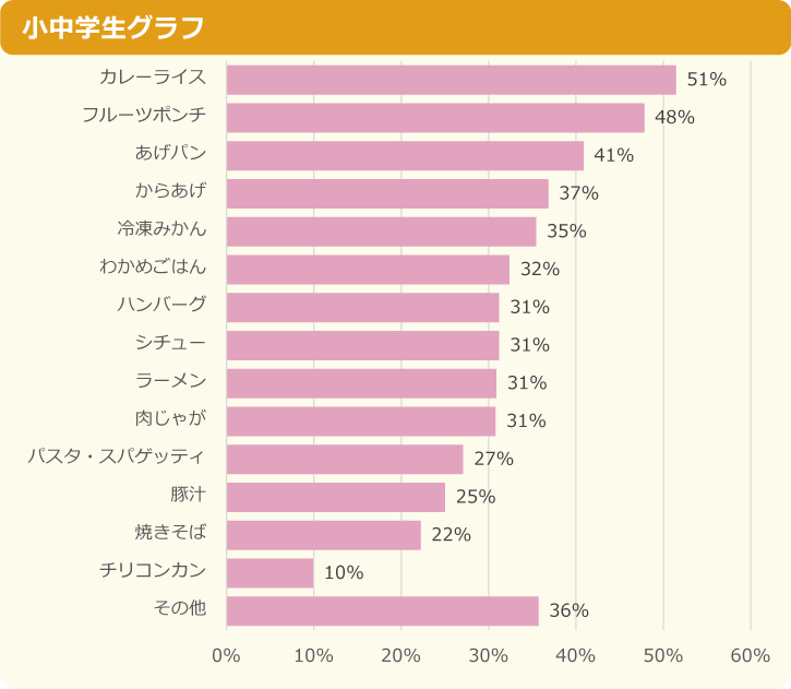 その他には「アジフライ」「うどん」「おでん」などがあり、中には「ゼリー」「ケーキ」というデザートメニューを答えた人もいました。中には「牛乳が一番好き」という意見も出ています。