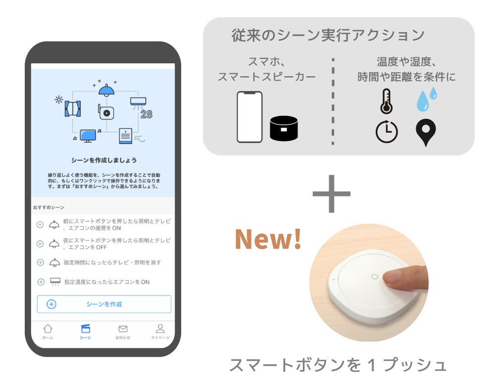 本製品を導入することで、従来の「スマホ」「スマートスピーカー」「温度、時間などの条件」だけでなく、「スマートボタン」でも家電の一括操作が可能に。