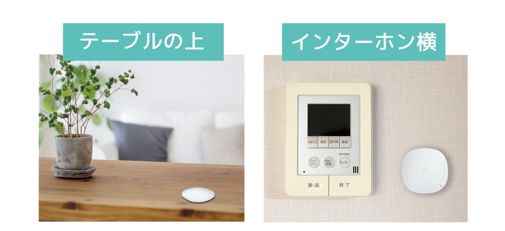 充電が完了したスマートボタンは、コンセントから離れた場所にも設置可能。ゴム足や両面テープも同梱しており、「平置き」「貼り付け」どちらのスタイルでも設置できます。