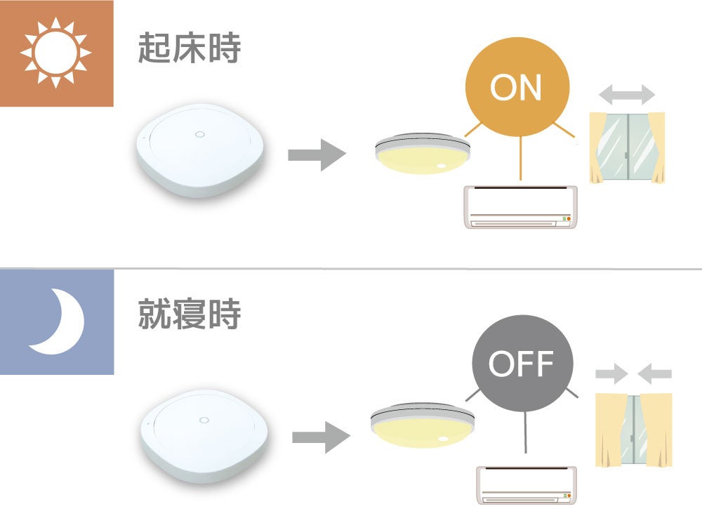例えば、朝の7時~9時は「照明・エアコン・電動カーテンON」を登録。