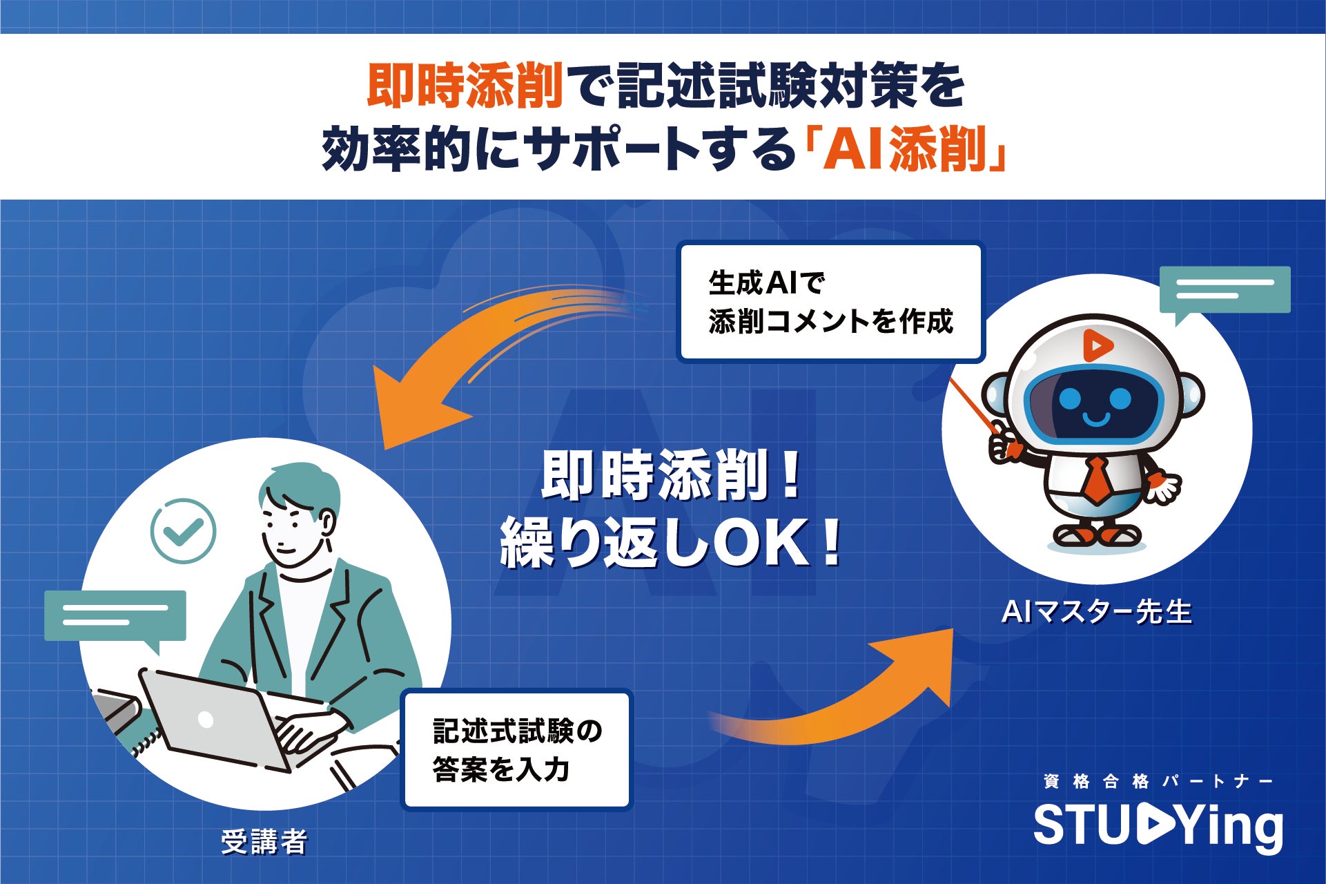 オンライン資格取得講座「STUDYing(スタディング)」を提供するKIYOラーニング株式会社(東京都千代田区、代表取締役社長:綾部貴淑)は、対策が難しいとされる記述式試験において、生成AIを活用して受講生の答案に個別添削を実施する「AI添削」機能を新たにリリースいたしました。学習を止めない「即時添削」とAIだからこそ可能な「繰り返し添削」によって、忙しくて時間がない受験生の”効率的な学習”サポートを一層強化してまいります。