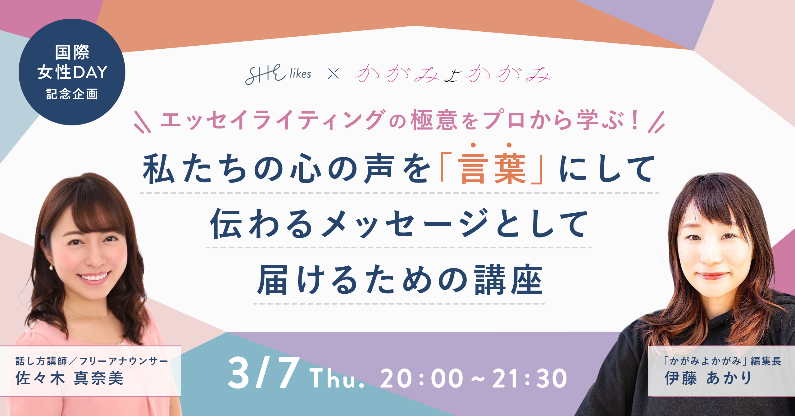 学ぶから働くまでをサポートする女性向けキャリアスクール「SHElikes(シーライクス)」を運営するSHE株式会社(所在地:東京都港区、代表取締役CEO/CCO:福田恵里、以下SHE)は、企業のコンテンツマーケティングやメディアビジネス等を支援するサムライト株式会社(本社:東京都渋谷区、代表取締役社長:池戸 聡、以下サムライト)が運営する女性向けエッセイ投稿サイト「かがみよかがみ」と共同でエッセイライティングスキルの向上を目指すオンラインイベントを開催します。国際女性デーに向けた企画として、「私たちの心の声を『言葉』にして伝わるメッセージとして届けるための講座」と題し、かがみよかがみの伊藤あかり編集長が講師を務めます。