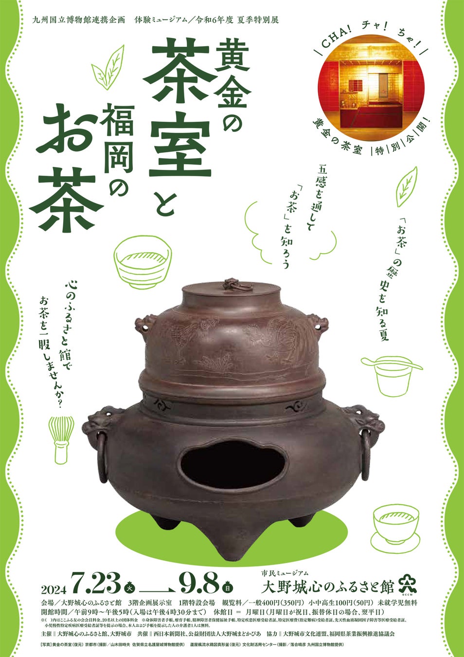 大野城心のふるさと館では、お茶をテーマに、福岡県が誇る芦屋釜の茶の湯釜や豊臣秀吉が作らせた黄金の茶室の再現を中心に、古代から現代までのお茶の歴史に関する資料類を展示します。