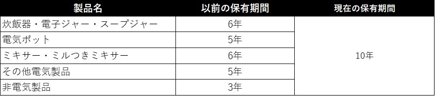 各製品の補修用性能部品の保有期間(業界水準)とタイガー魔法瓶の保有期間