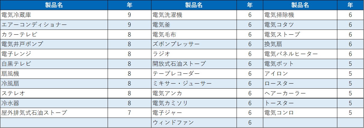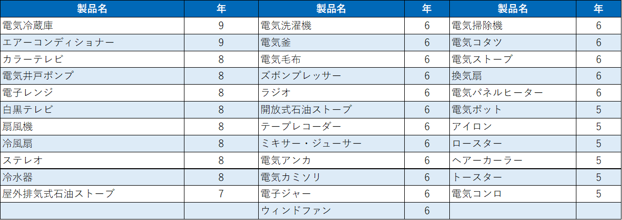 経済産業省の指導で、各家電ごとに家電製品の機能を維持するために必要な部品である「補修用性能部品」の最低保有年数が定められており、家電メーカーは製品が故障した際に修理できる部品を一定期間、保有しています。冷蔵庫なら9年、カラーテレビなら8年、炊飯器なら6年が最低保有年数です。