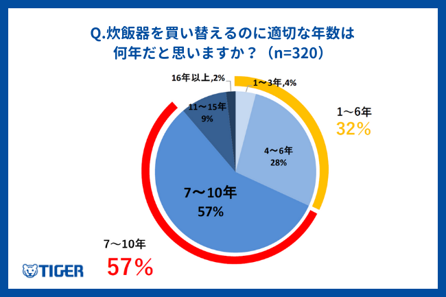 当社の主力商品である炊飯器に限定してみると、現在自宅で使用している炊飯器を7年以上使っているという人は3人に1人にあたる41%という結果に。また、炊飯器を買い替えるのに適切な年数について聞いたところ、1~6年と答えた人が32%だったのに対し、7~10年と答えた人は57%おり、一度購入されると7年以上使うことを見越して使用される方が多いことがわかりました。